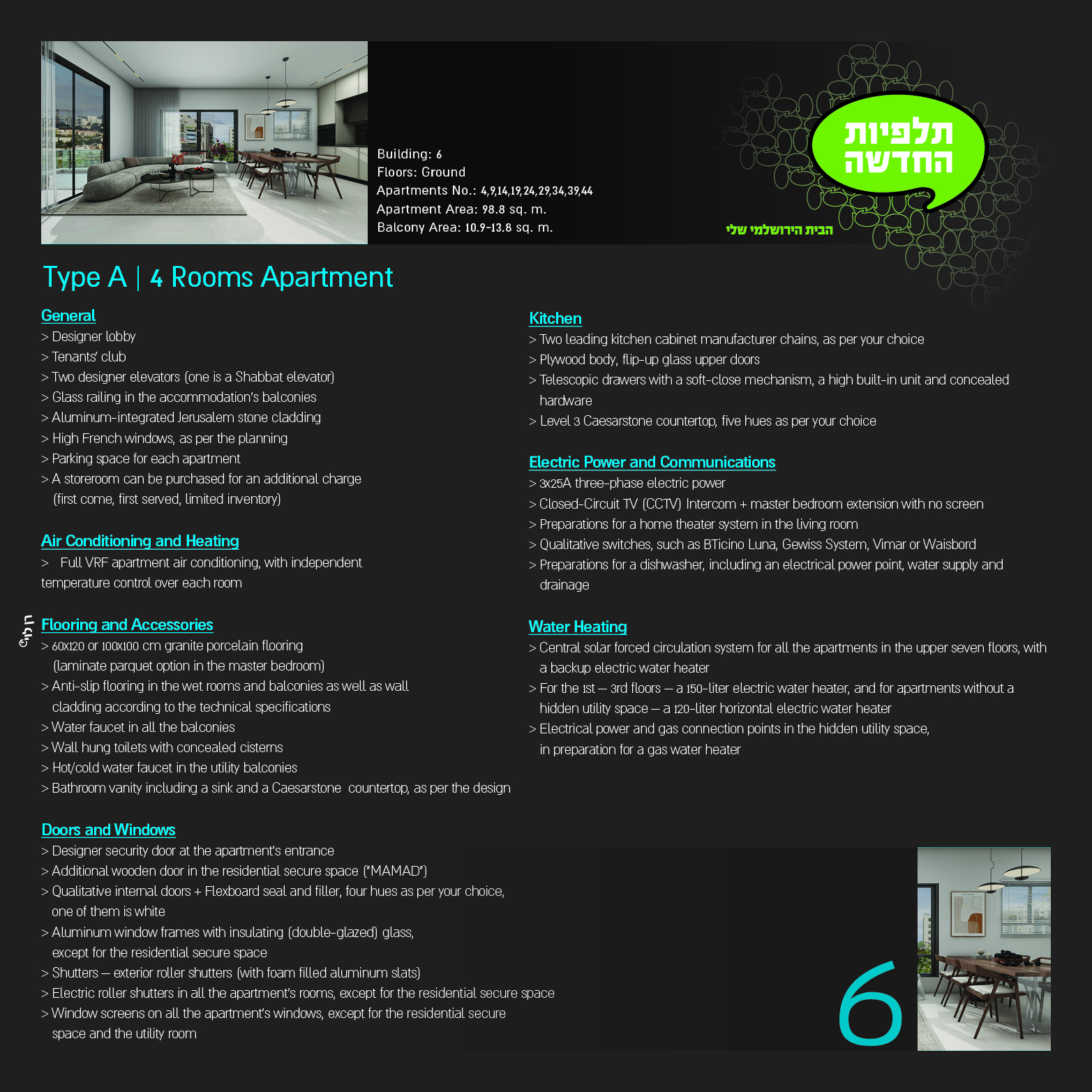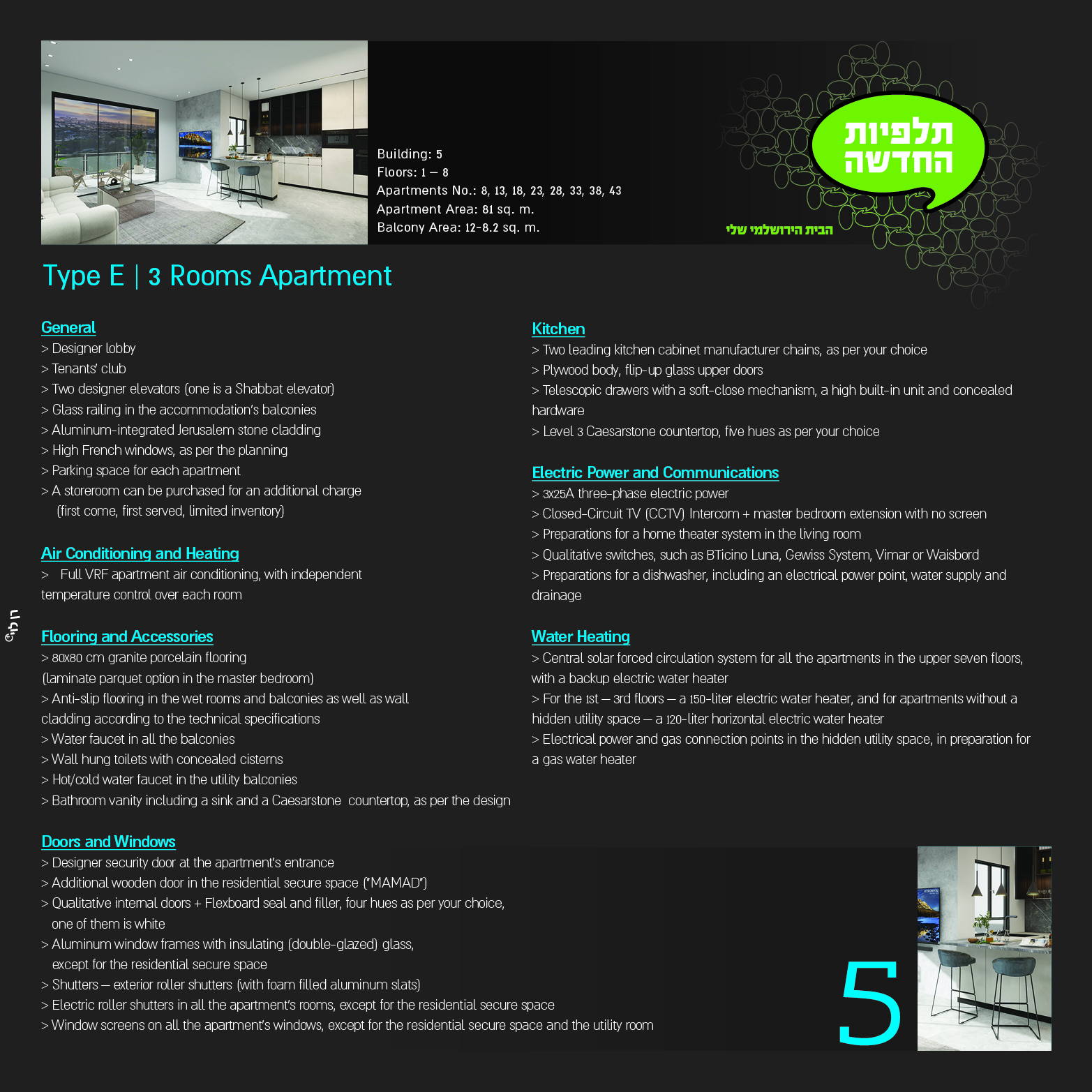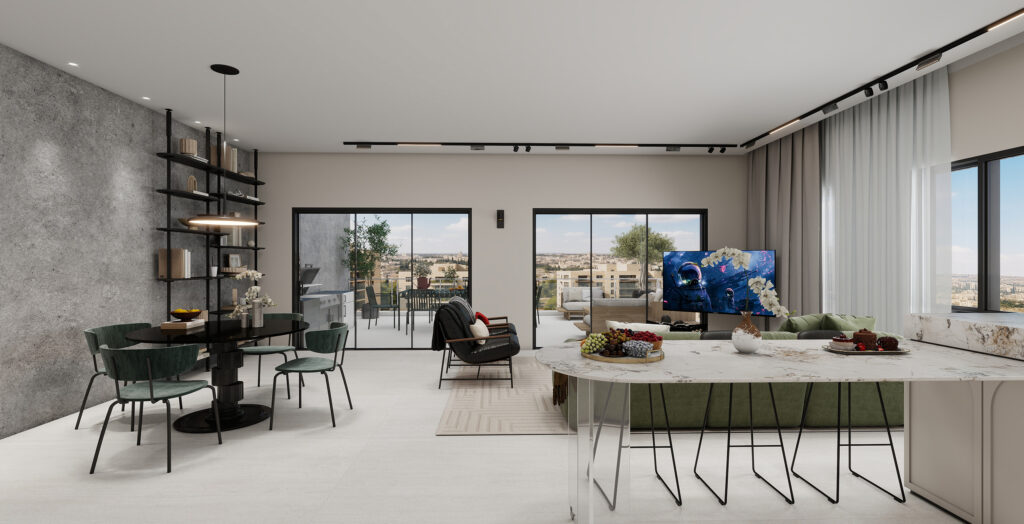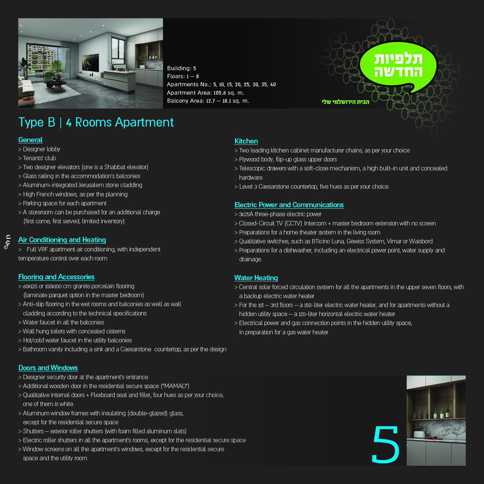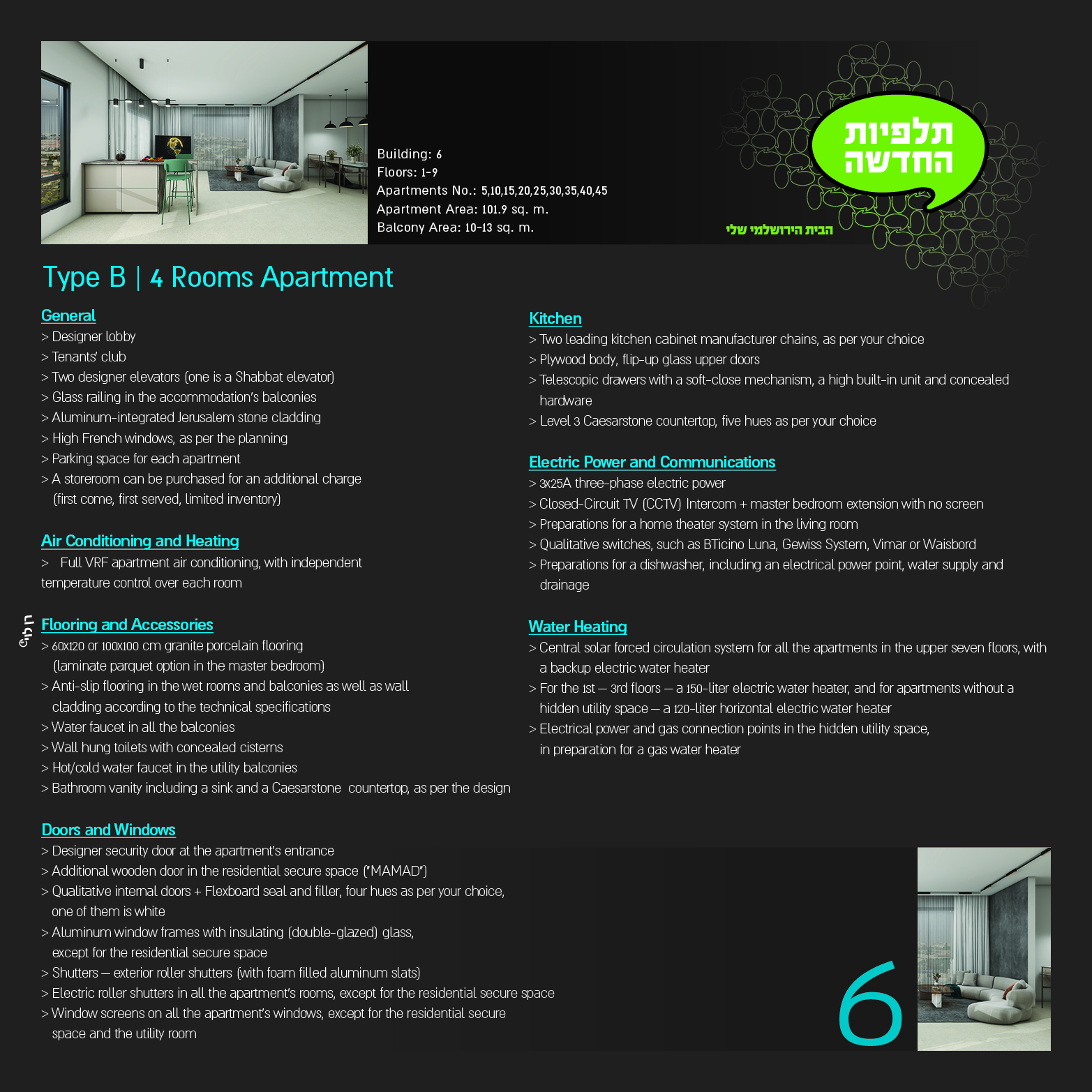 We are pleased to invite you to join the Stage 2 of the New Talpiot project, which was designed by world-class architectural firm Mann Shinar, and join the high-quality and cohesive community of residents who live in the project’s first stage. The project residents enjoy a luxurious lobby designed by the world-class architect Nir Portal, covered parking, and storerooms. A green park and a prestigious street mall will be established in the heart of the project. The project has eight spacious buildings with 2-5 room apartments, mini penthouses, penthouses. The first buildings in the first stage are already occupied and two buildings of the second stage are now being marketed.