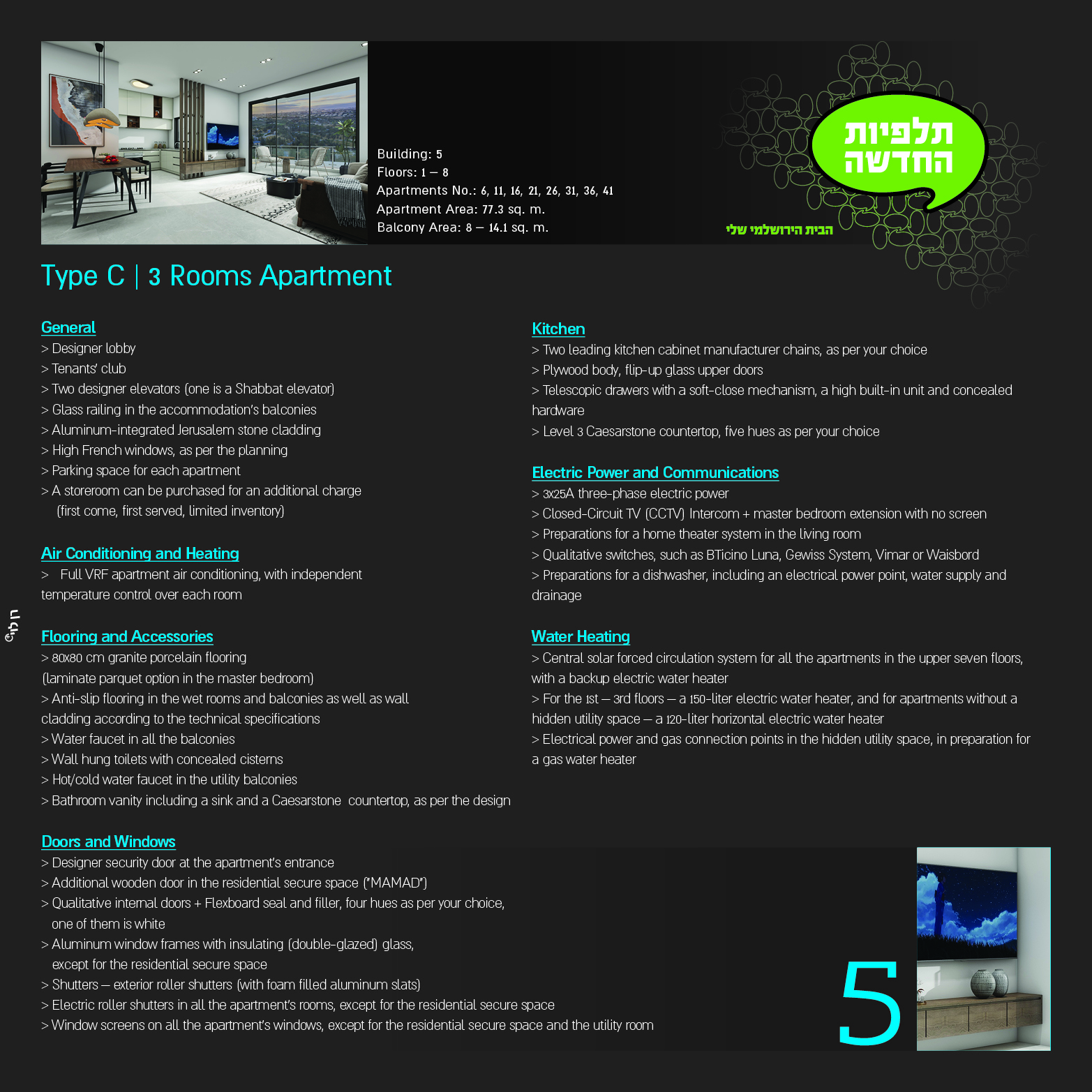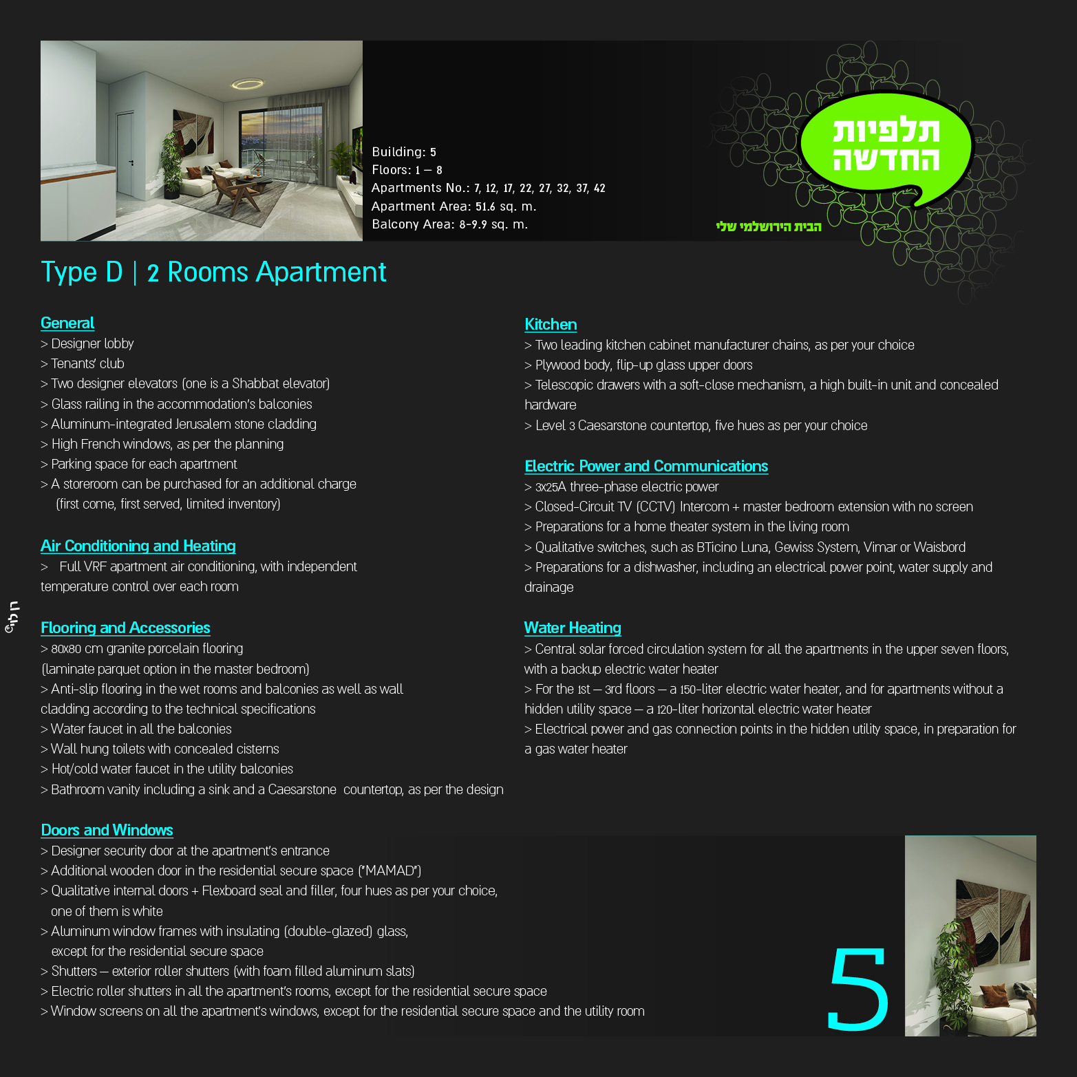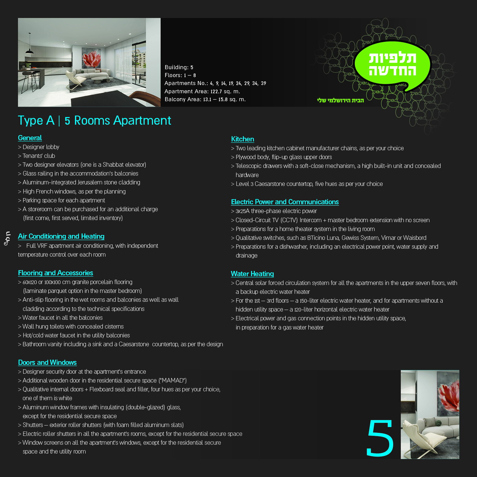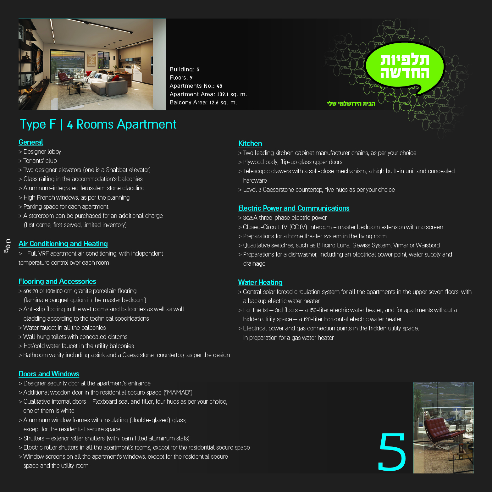 We are pleased to invite you to join the Stage 2 of the New Talpiot project, which was designed by world-class architectural firm Mann Shinar, and join the high-quality and cohesive community of residents who live in the project’s first stage. The project residents enjoy a luxurious lobby designed by the world-class architect Nir Portal, covered parking, and storerooms. A green park and a prestigious street mall will be established in the heart of the project. The project has eight spacious buildings with 2-5 room apartments, mini penthouses, penthouses. The first buildings in the first stage are already occupied and two buildings of the second stage are now being marketed.