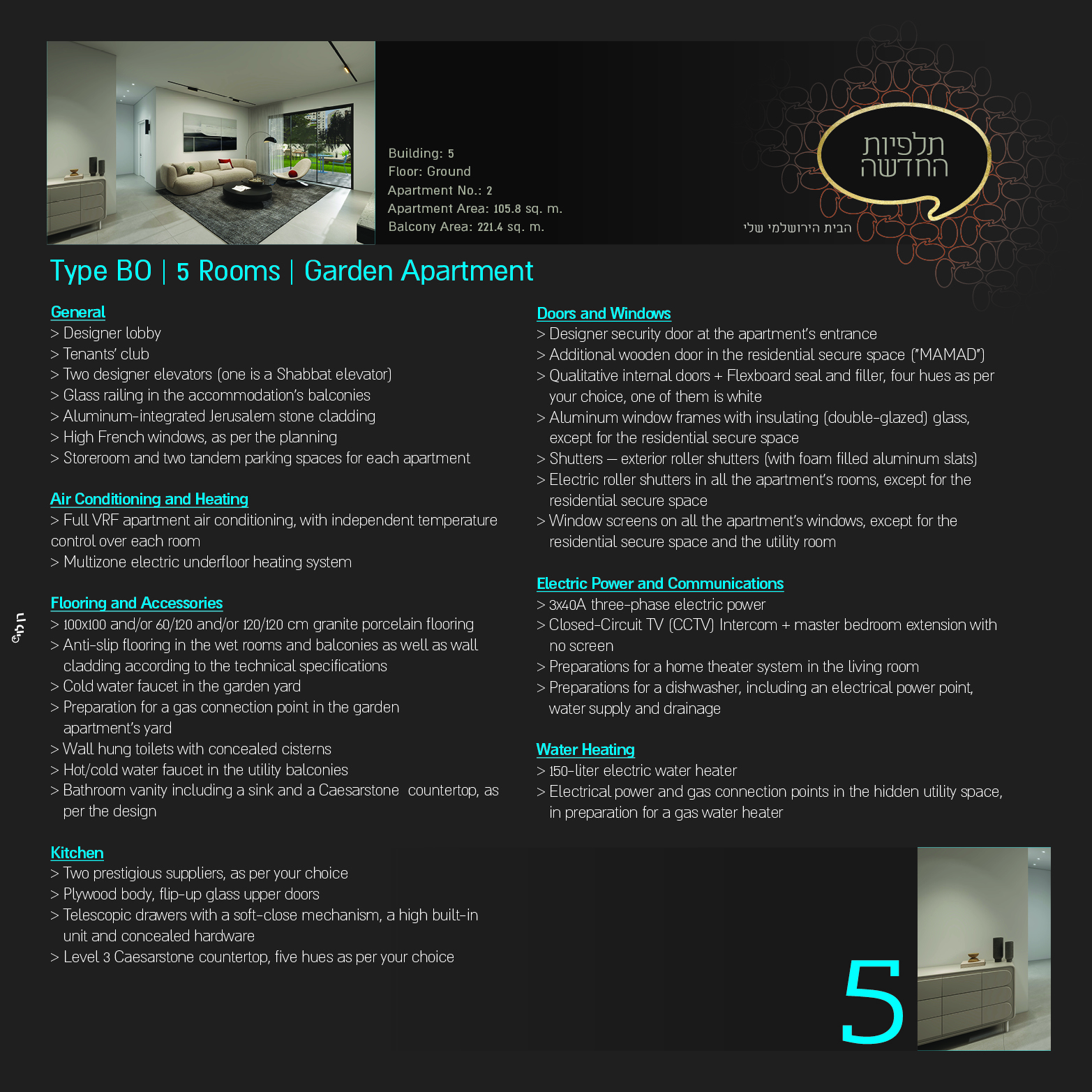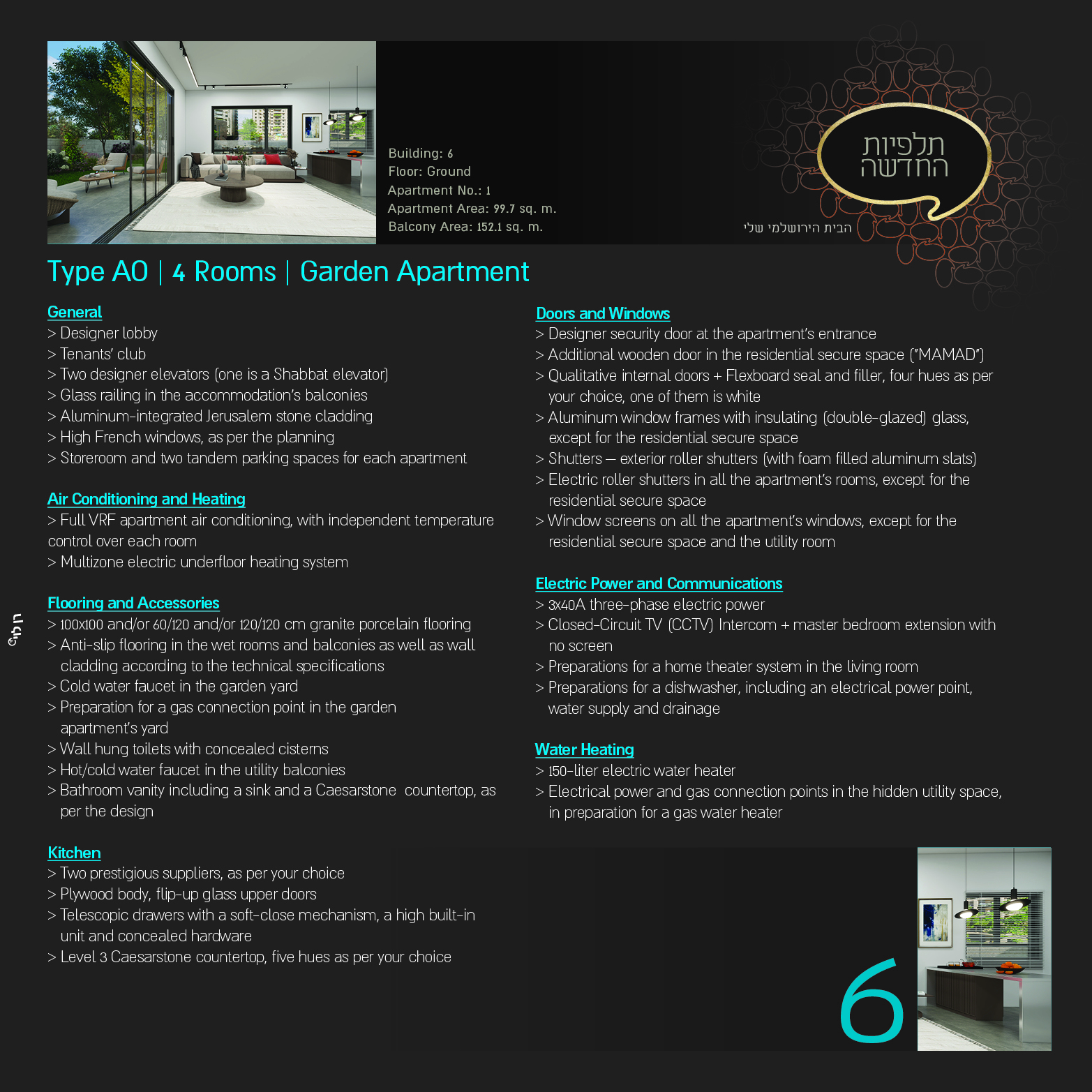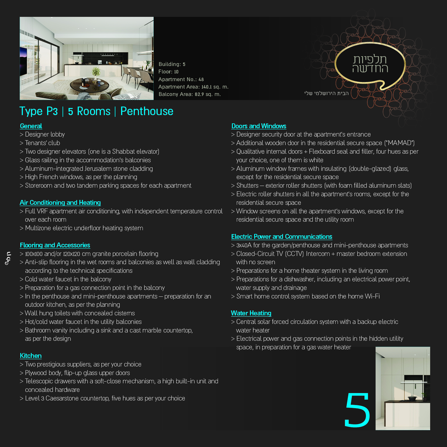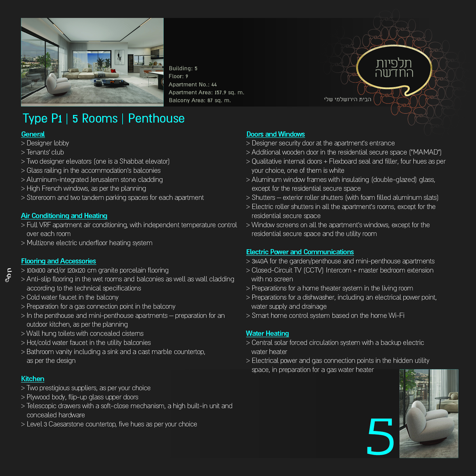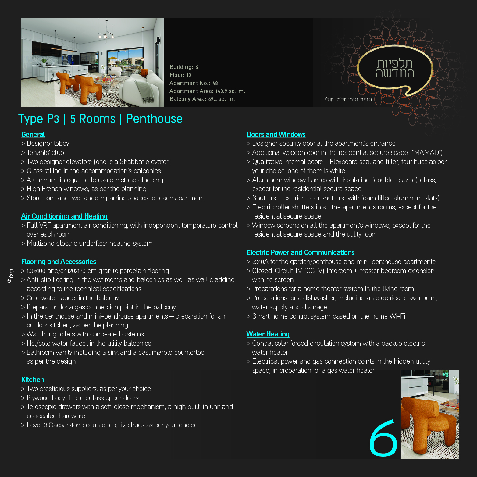 We are pleased to invite you to join the Stage 2 of the New Talpiot project, which was designed by world-class architectural firm Mann Shinar, and join the high-quality and cohesive community of residents who live in the project’s first stage. The project residents enjoy a luxurious lobby designed by the world-class architect Nir Portal, covered parking, and storerooms. A green park and a prestigious street mall will be established in the heart of the project. The project has eight spacious buildings with 2-5 room apartments, mini penthouses, penthouses. The first buildings in the first stage are already occupied and two buildings of the second stage are now being marketed.