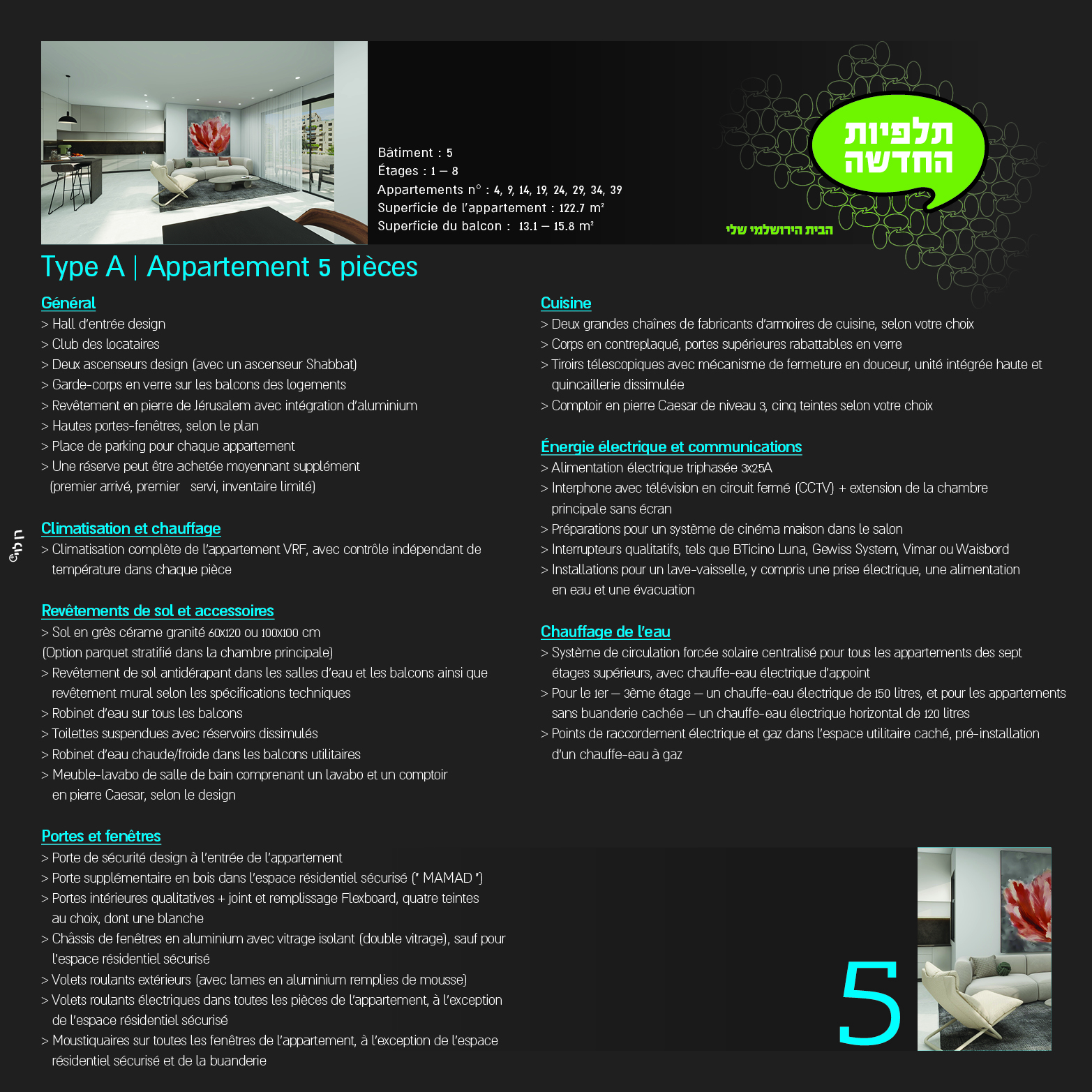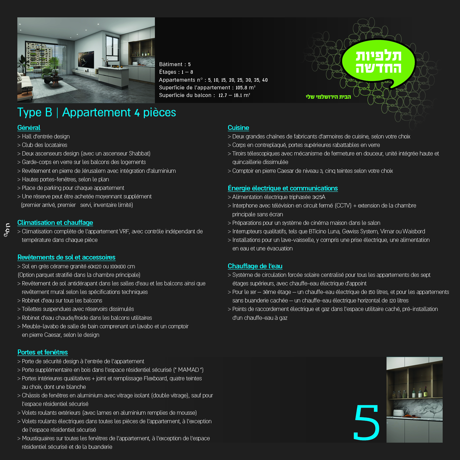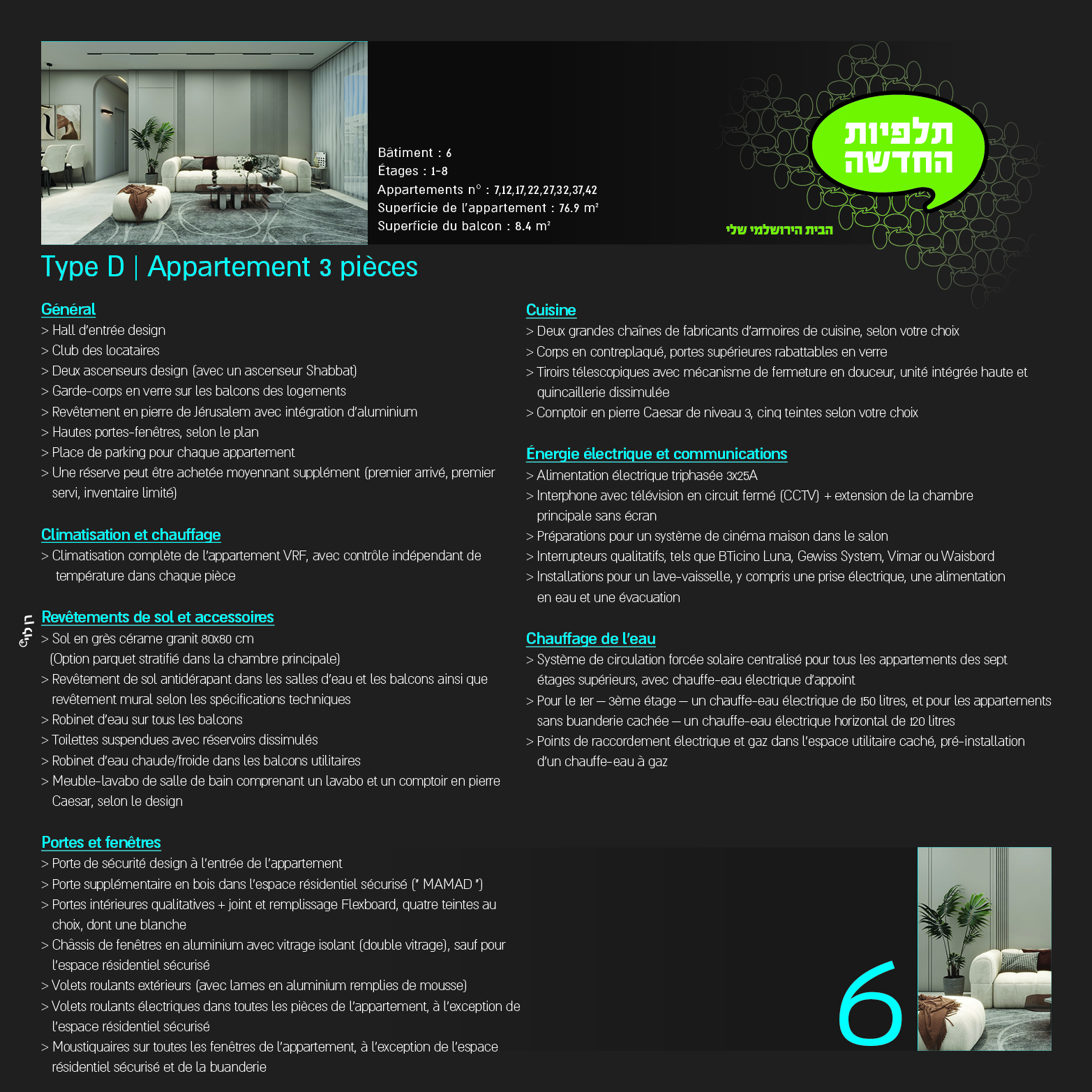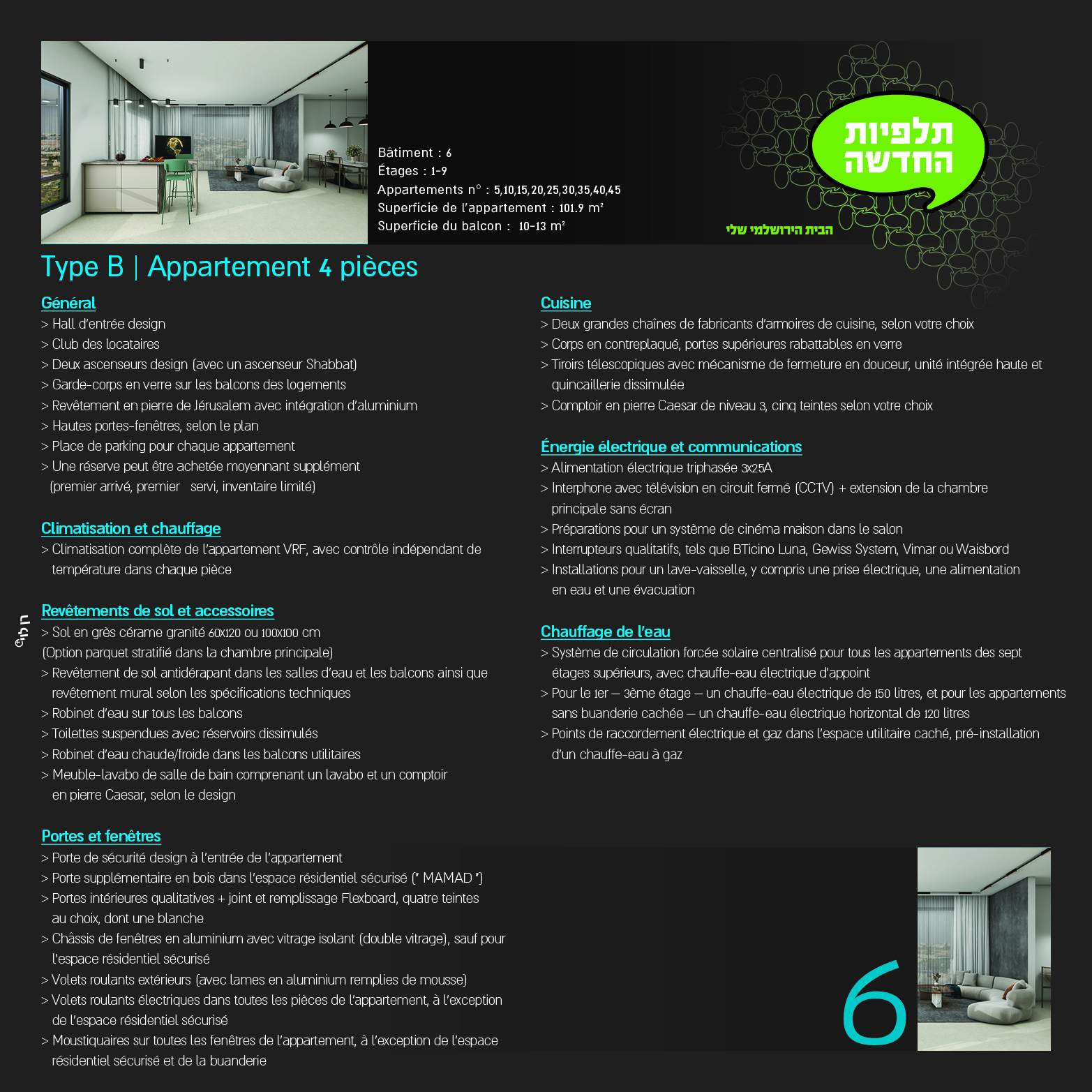Nous sommes ravis de vous inviter à adhérer au projet « New Talpiot » 2ème étape, conçu par le cabinet international d’architectes Mann Shin’ar, et à rejoindre la communauté de qualité qui s’est formée à la première étape. Les locataires profiteront d’un lobby de grand luxe conçu par l’architecte de renommée internationale, Nir Portal, d’une place dans le parking souterrain et d’un entrepôt. Au cœur du projet, il y aura un parc luxuriant avec jeux pour enfants, avec le prestigieux STREET MALL à proximité. Le projet comptera 8 immeubles de grand luxe avec des appartements de 2 à 5 pièces, des appartements-jardin, des mini-penthouses et des penthouses. Les 4 immeubles de la première étape ont déjà été emménagés et les 2 immeubles de la 2ème étape sont en cours de commercialisation.