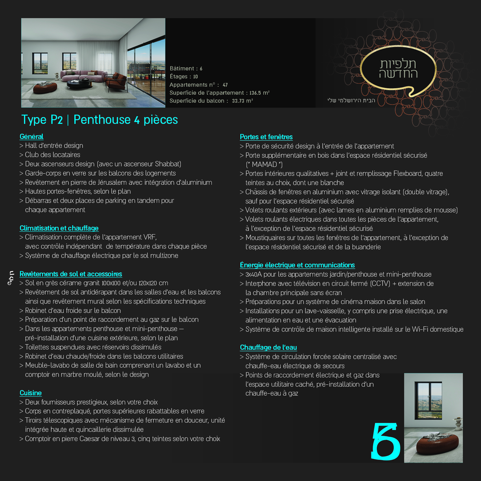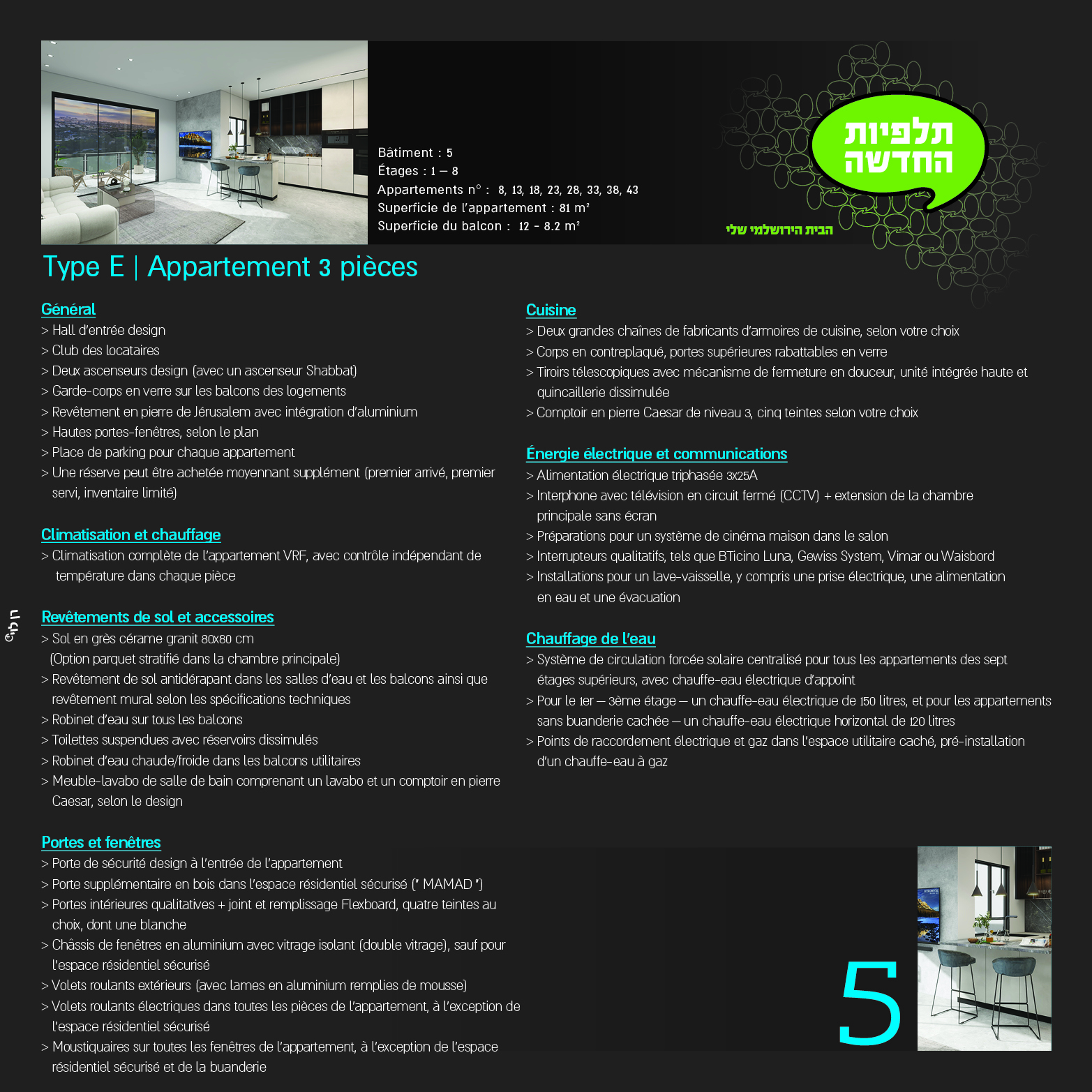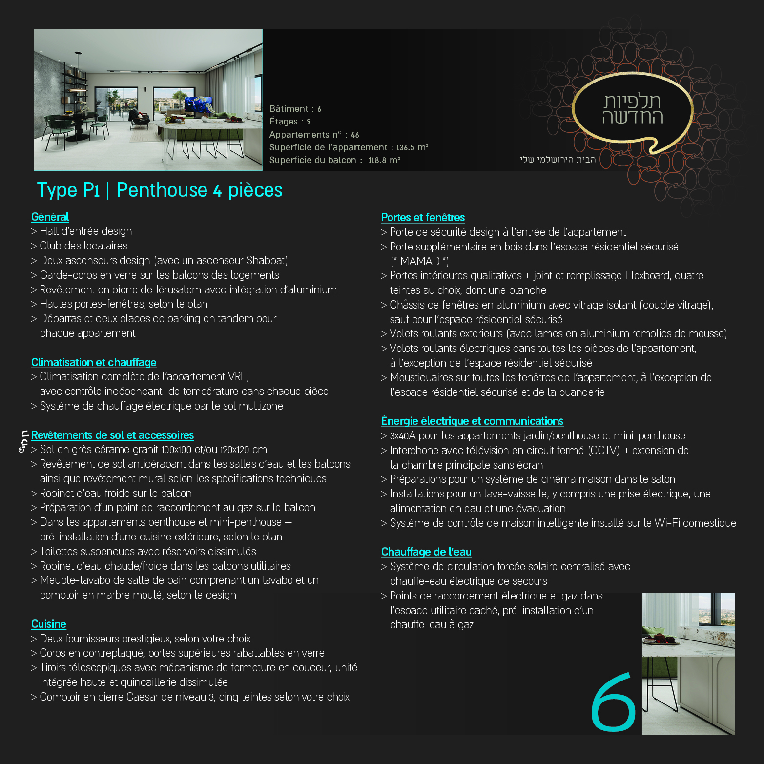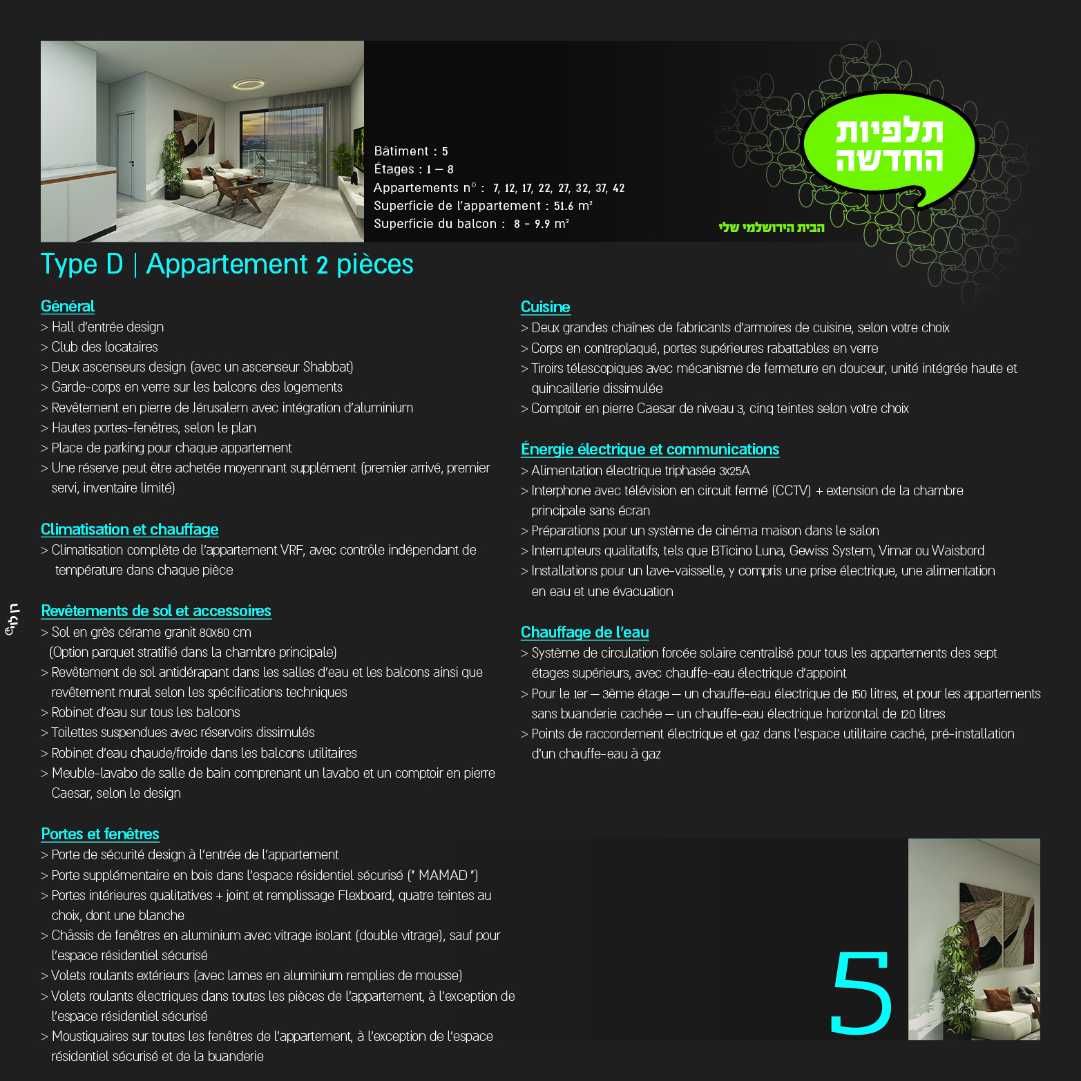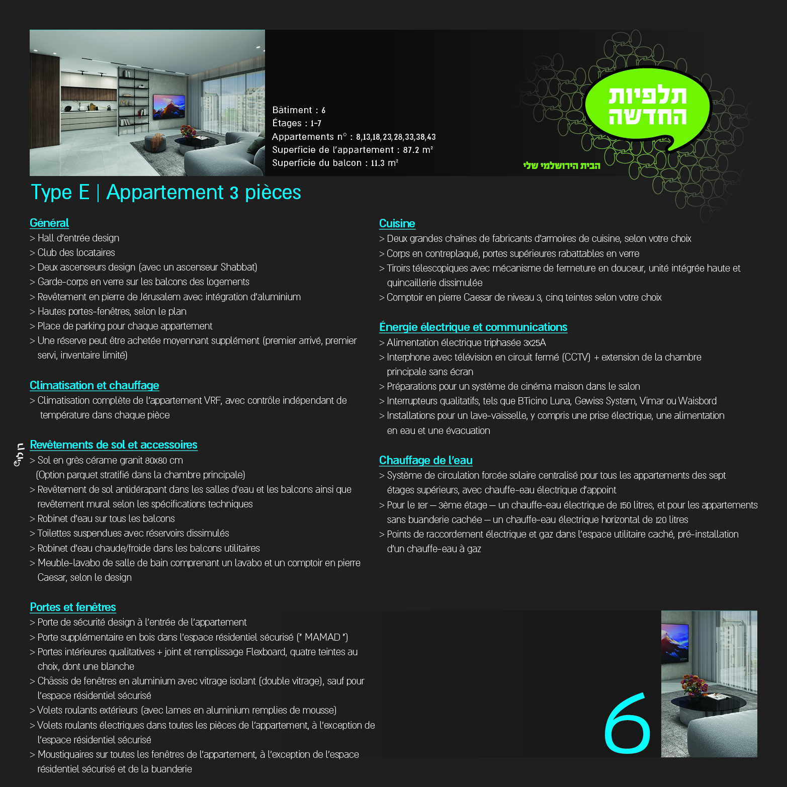 Nous sommes ravis de vous inviter à adhérer au projet « New Talpiot » 2ème étape, conçu par le cabinet international d’architectes Mann Shin’ar, et à rejoindre la communauté de qualité qui s’est formée à la première étape. Les locataires profiteront d’un lobby de grand luxe conçu par l’architecte de renommée internationale, Nir Portal, d’une place dans le parking souterrain et d’un entrepôt. Au cœur du projet, il y aura un parc luxuriant avec jeux pour enfants, avec le prestigieux STREET MALL à proximité. Le projet comptera 8 immeubles de grand luxe avec des appartements de 2 à 5 pièces, des appartements-jardin, des mini-penthouses et des penthouses. Les 4 immeubles de la première étape ont déjà été emménagés et les 2 immeubles de la 2ème étape sont en cours de commercialisation.