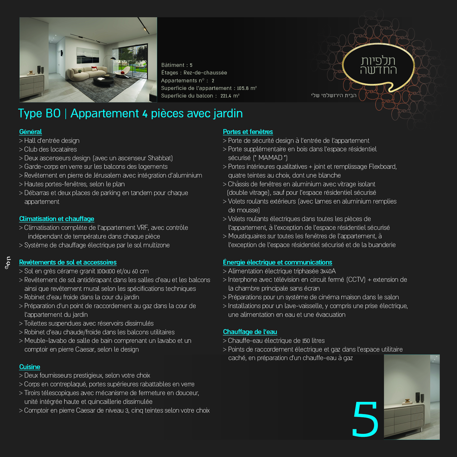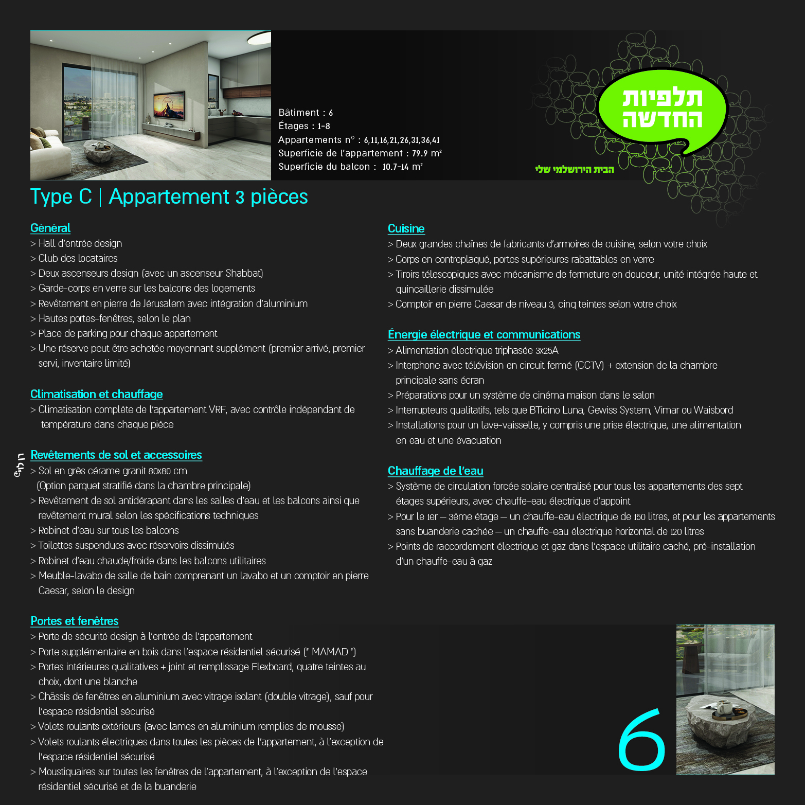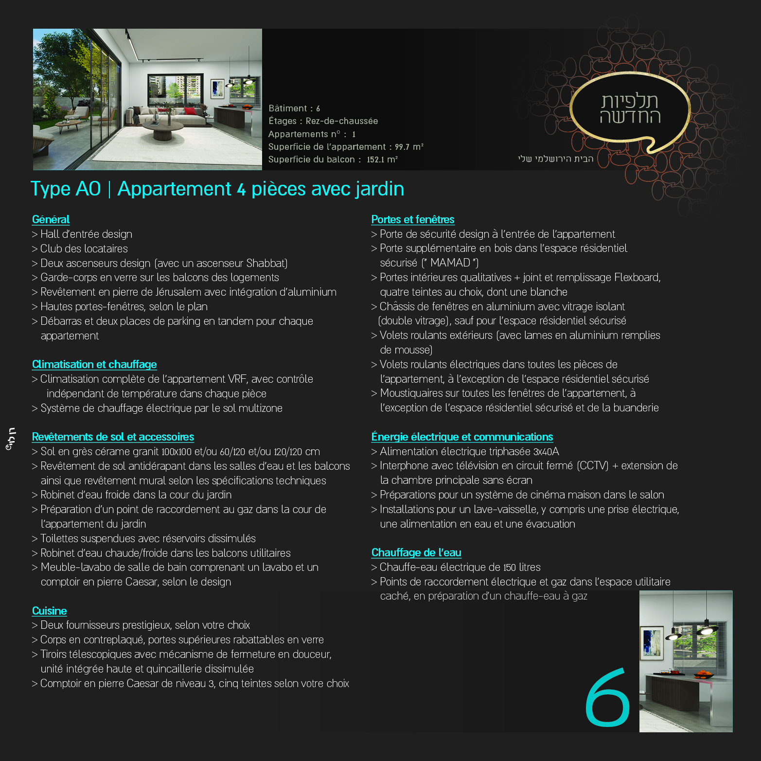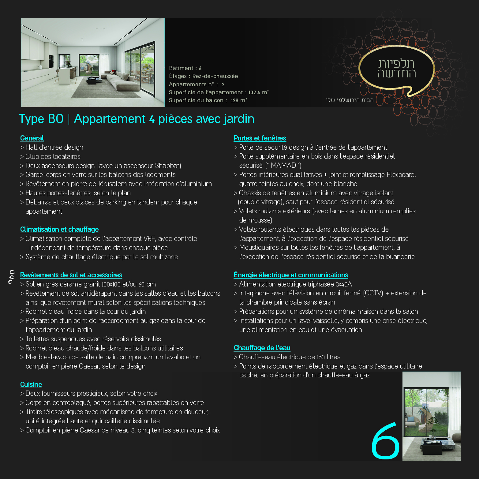 Nous sommes ravis de vous inviter à adhérer au projet « New Talpiot » 2ème étape, conçu par le cabinet international d’architectes Mann Shin’ar, et à rejoindre la communauté de qualité qui s’est formée à la première étape. Les locataires profiteront d’un lobby de grand luxe conçu par l’architecte de renommée internationale, Nir Portal, d’une place dans le parking souterrain et d’un entrepôt. Au cœur du projet, il y aura un parc luxuriant avec jeux pour enfants, avec le prestigieux STREET MALL à proximité. Le projet comptera 8 immeubles de grand luxe avec des appartements de 2 à 5 pièces, des appartements-jardin, des mini-penthouses et des penthouses. Les 4 immeubles de la première étape ont déjà été emménagés et les 2 immeubles de la 2ème étape sont en cours de commercialisation.